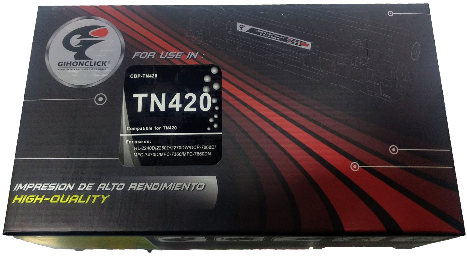 TN420 NUEVO MARCA GIHONCLICK TOTALMENTE NUEVO NO REMANOFACTURADO NI RELLENADO LLENO DE POLVO POLOMERIZADO LO CUAL DA IMPRESIONES MUY FIRMES EN EL COLOR, NEGROS NITIDOS Y DURADEROS COMPATIBLE CON ESTAS IMPRESORAS BROTHER  DCP-7055 7057dw MFC-7240 CARTUCHO DE ALTO RENDIMIENTO GARANTIZADO COMPLETAMENTE NUEVO LO PUEDE RELLENAR MAXIMO 3 VECES PARA TNER UNA CALIDAD EXCELENTE